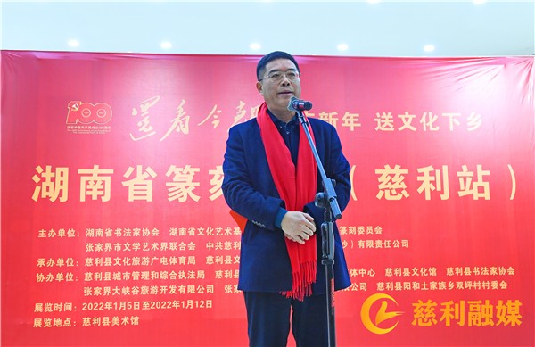 为欢庆新年, 送文化下乡,1月5日上午,“还看今朝——湖南省篆刻巡展(慈利站)”在县文化馆开幕。前中书协理事、省书协副主席兼篆刻委员会主任王集,中书协理事、省书协副主席兼秘书长胡紫桂,省书协理事、篆刻委员会副主任兼秘书长刘命清等省市县书法家,县领导朱超雄、吴永恒、李依芳出席活动。