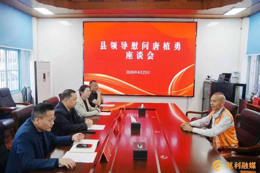 4月23日,县委副书记、县委政法委书记李巍,县委常委、县委宣传部部长张娟慰问在武汉至深圳高速公路上徒手砸窗救出两名被困人员的救人英雄唐植勇,为他送上慰问金并致以崇高敬意。