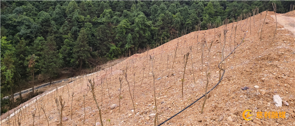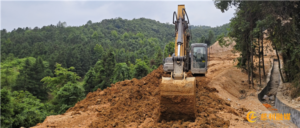 在苗市镇湖南界溪生态黄牛养殖项目用地生态保护修复工程现场,记者看见,大片黄土裸露、植被稀疏的山体已经被工人种植上成活的小树苗,三台挖掘机正在紧锣密鼓的进行施工,修建排水沟、蓄水池、播撒草籽,以保障新种植的植被能够获得足够的水分和养分,确保复绿工作见行见效。
