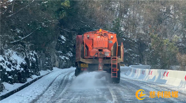 1月23日,记者在S518高峰路段看到,高山、田野、道路上都已被一层厚厚白雪覆盖,冰天雪地里、一片雪白中,一群橘红色的身影格外耀眼,他们正浴“雪”奋战,在急弯陡坡、背阴路段撒上工业盐除雪破冰,改善行车条件和路域环境,护航人民群众出行。