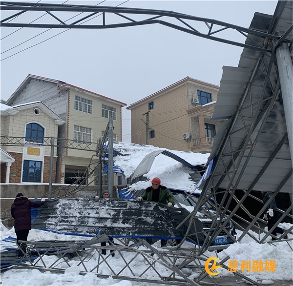 第二天在附近热心群众的帮助下,陈师傅找到政府和社区,所幸没有造成人员伤亡,车辆损伤也不严重,杨勇军立即号召附近党员群众合力清理垮塌的棚,附近居民看到后,陆续加入到清理队伍中,大家分工合作,铲雪、切割、搬运……经历3个多小时的爱心接力,终于成功“解救”出被困车辆。